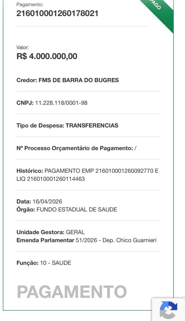 O município de Barra do Bugres recebeu um reforço histórico em seus cofres públicos nesta semana. O governo estadual confirmou o pagamento de uma emenda parlamentar no valor de R$ 4 milhões, destinada pelo deputado estadual Chico Guarnieri. O recurso, já liquidado e disponível no Fundo Municipal de Saúde (FMS), representa um dos maiores investimentos diretos viabilizados pelo parlamentar para a região em 2026, consolidando sua base política e a parceria com a gestão local.