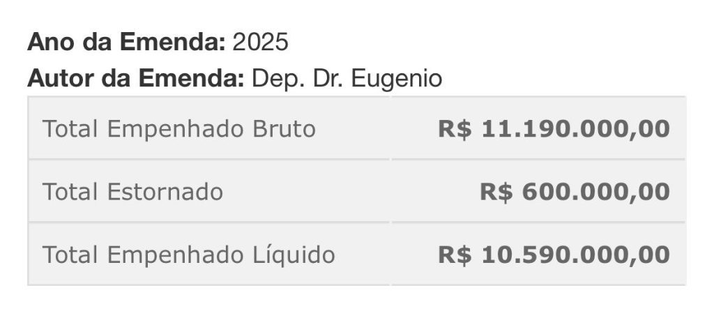 Mesmo com um mandato de perfil discreto, o deputado estadual Dr. Eugênio (PSB), com base política no Araguaia, tem mostrado forte atuação no que realmente importa para os municípios: resultados concretos. Em 2025, o parlamentar empenhou um total bruto de R$ 11.190.000,00 em emendas, das quais apenas R$ 600 mil foram estornados. O valor líquido efetivamente garantido chegou a R$ 10.590.000,00, o que reforça sua capacidade de articulação e compromisso com o desenvolvimento da região. Com ações voltadas especialmente à saúde, infraestrutura e assistência social, Dr. Eugênio se consolida como um dos deputados mais operosos no envio de recursos para o interior de Mato Grosso.