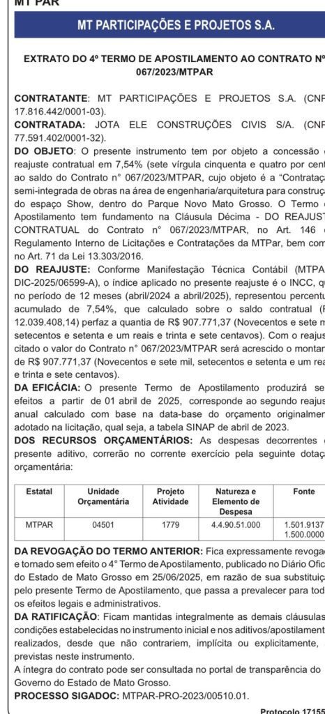 A sangria de recursos no Parque Novo Mato Grosso parece não ter fim. A MT Participações e Projetos S.A. (MT PAR) concedeu um novo reajuste à Jota Ele Construções Civis S.A., no valor de R$ 907.771,37, correspondente a 7,54% sobre o saldo contratual de mais de R$ 12 milhões. Trata-se do 4º termo de apostilamento ao contrato nº 067/2023, assinado para a construção do chamado “Espaço Show”, um dos símbolos da monumentalidade eleitoreira do projeto.