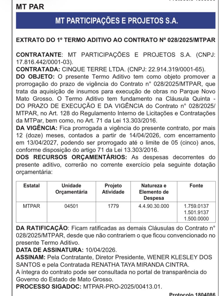 A MT Participações e Projetos S.A. (MT PAR) oficializou a prorrogação do contrato com a empresa Cinque Terre Ltda para a aquisição de insumos destinados às obras do Parque Novo Mato Grosso. O 1º Termo Aditivo, assinado pelo diretor-presidente Wener Klesley dos Santos, estende a vigência do acordo por mais 12 meses, garantindo o fluxo de materiais para o canteiro de obras até abril de 2027. O investimento é estratégico para o cronograma do Estado, utilizando recursos de diferentes fontes orçamentárias para manter o ritmo das intervenções no complexo.