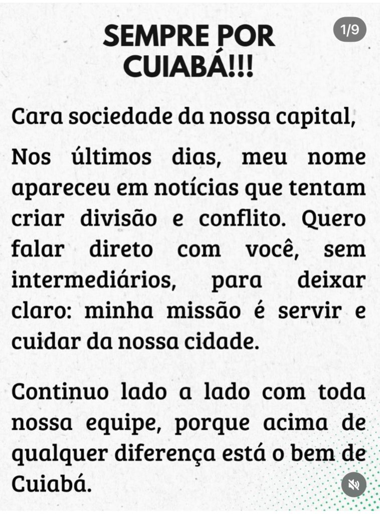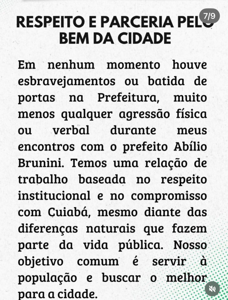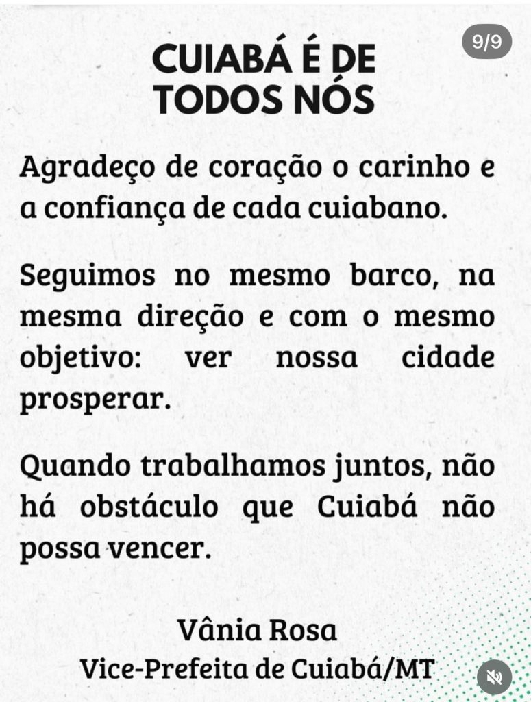 Em um movimento digno de novela mexicana, a vice-prefeita de Cuiabá, Vânia Rosa, publicou no Instagram uma nota de nove páginas embalada por música melosa para afirmar que está tudo ótimo com o prefeito Abílio Brunini — desmentindo até trechos do Boletim de Ocorrência registrado na Polícia, no qual sua própria advogada não poupou críticas ao chefe do Executivo.